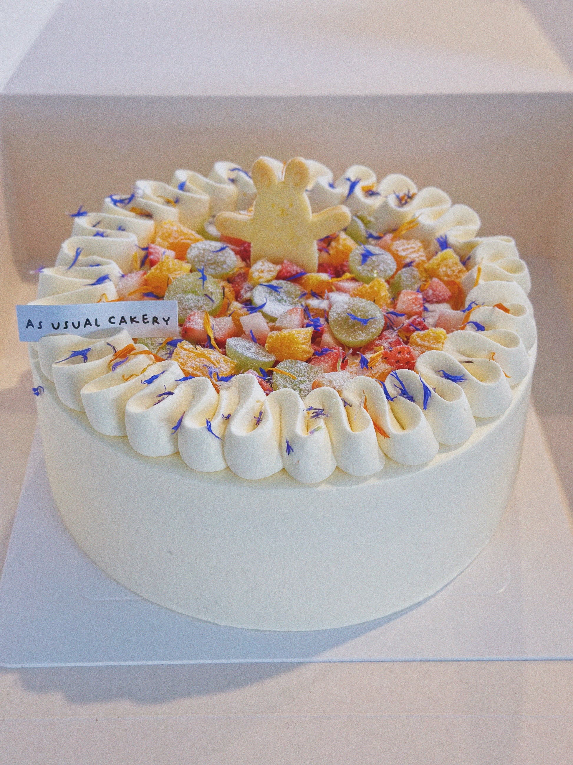 This cute & colorful chiffon cake celebrates the vibrant flavors of fresh seasonal fruits nestled atop cloud-like whipped cream.