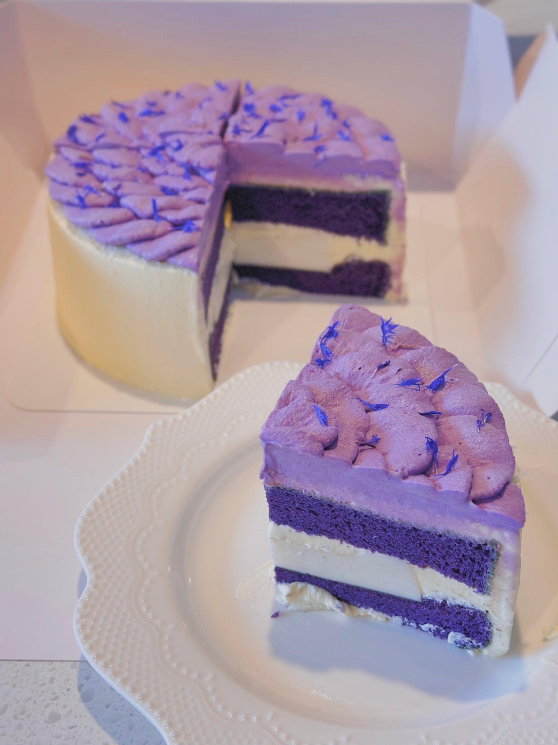 Introducing our stunning Taro Coconut Chiffon Cake, a purple flower that's almost too beautiful to eat. Taro is a flavour that is beloved in Asian desserts for it unique nutty taste and beautiful purple color.